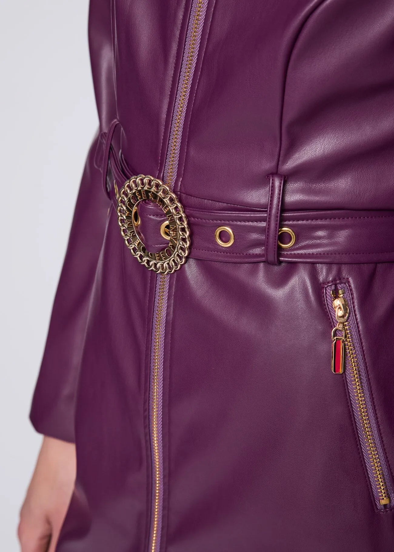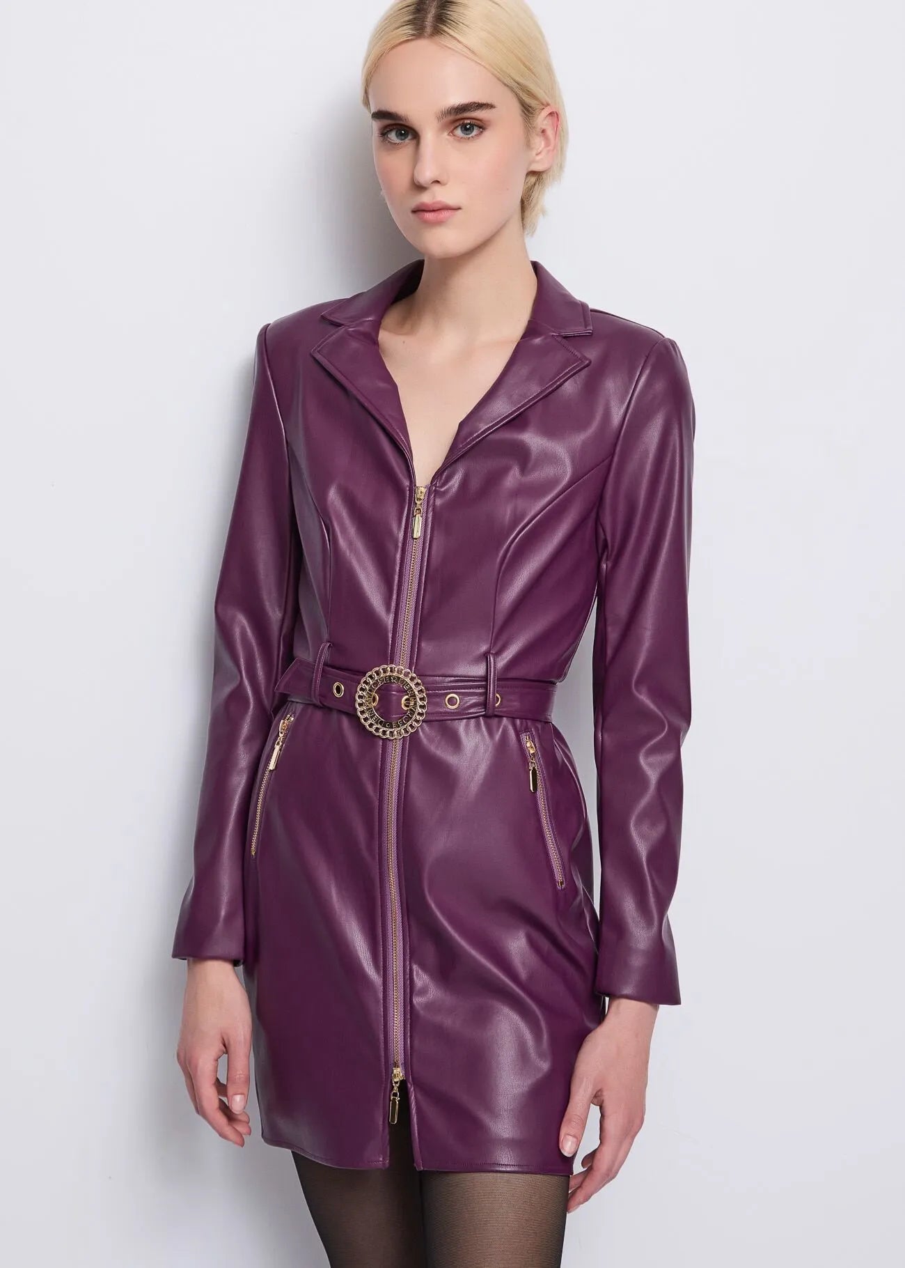 Mini abito viola in similpelle Mini abito in similpelle Scollatura rotonda Maniche lunghe Tirazip logata Chiusura con zip a doppio cursore