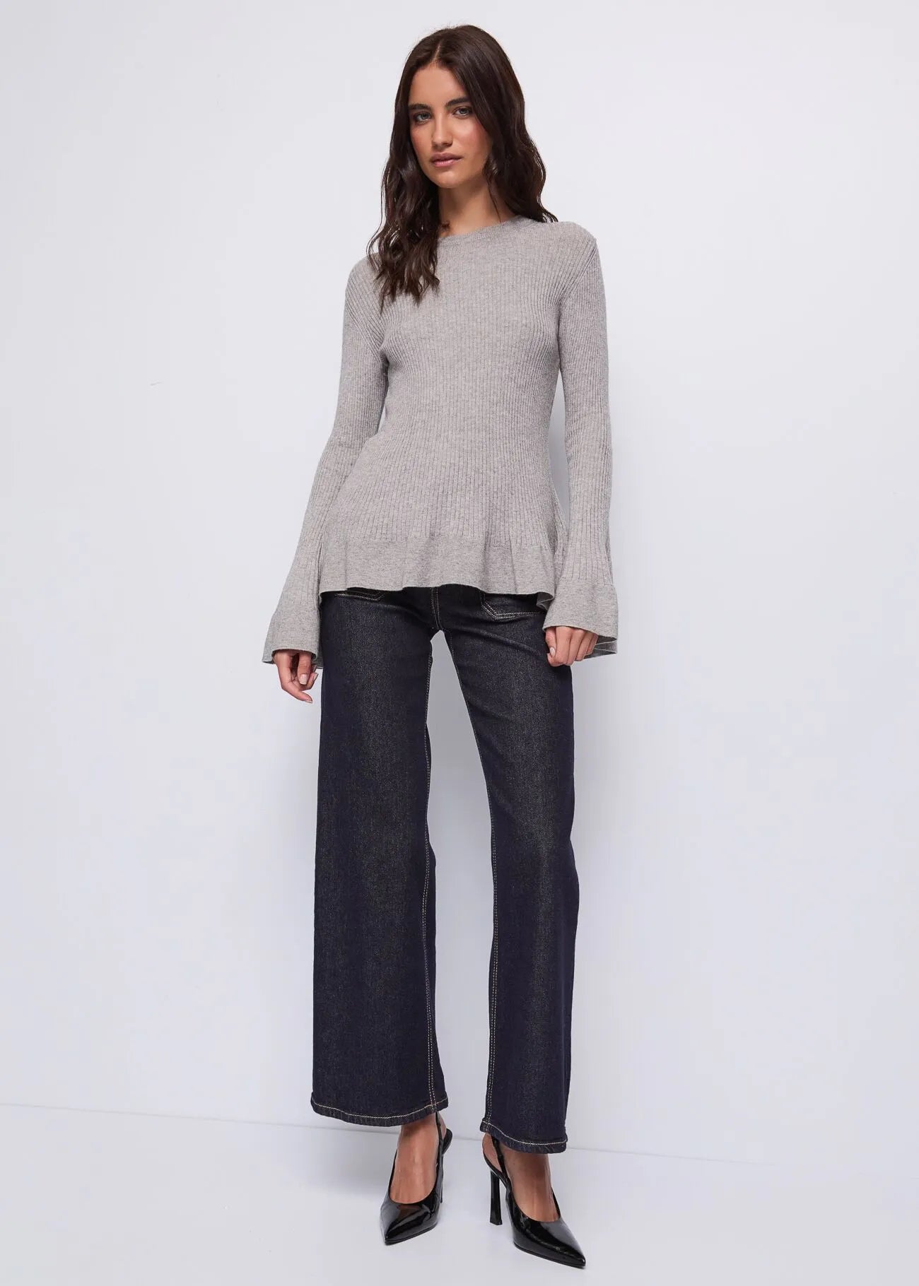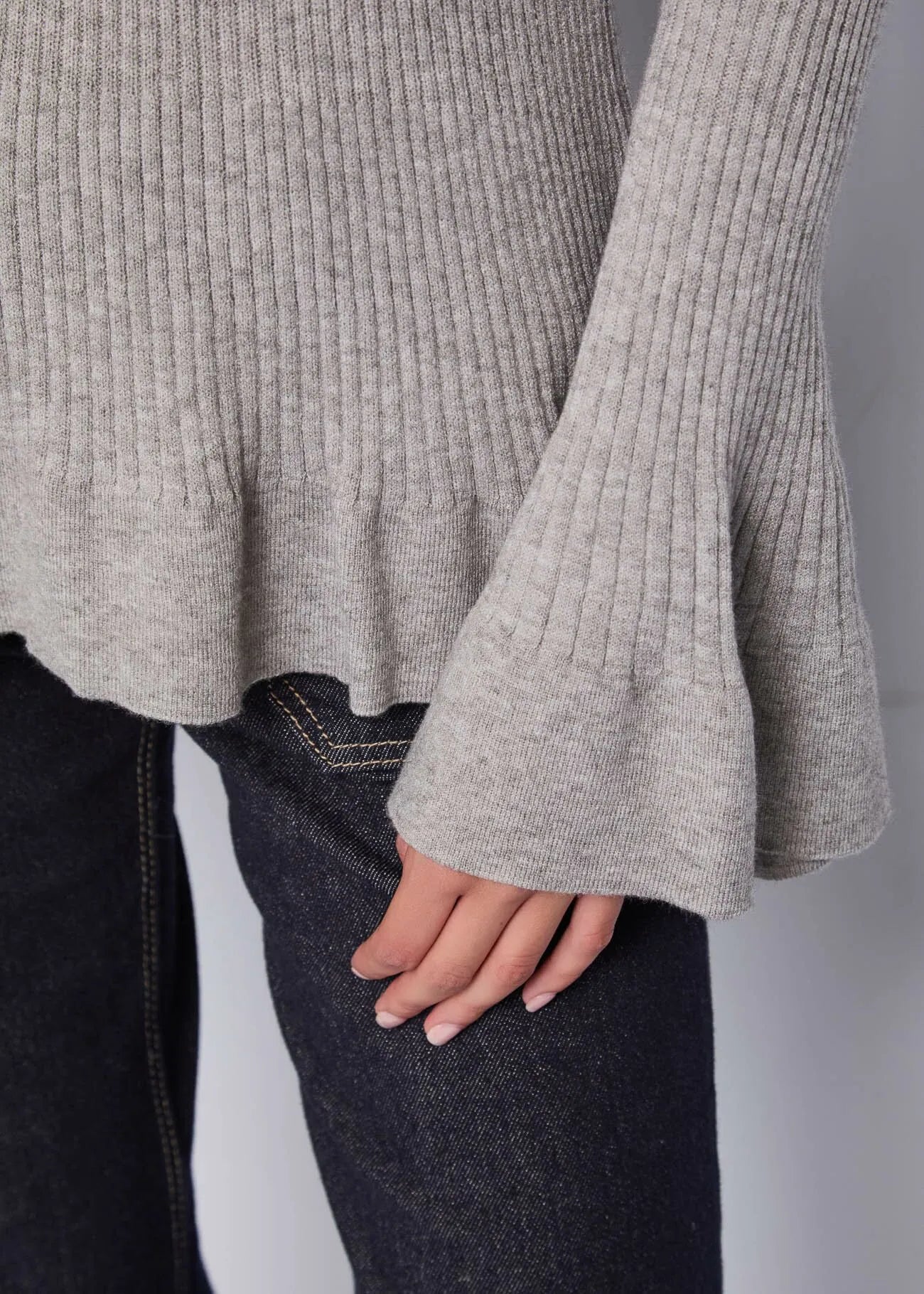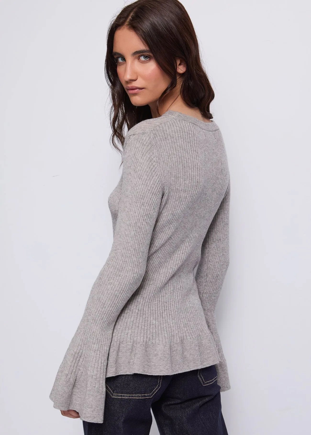 Maglia grigia in filato a costine Maglia in filato di misto viscosa Lavorazione a costine Girocollo Maniche lunghe Polsi a campanella Charm con strass