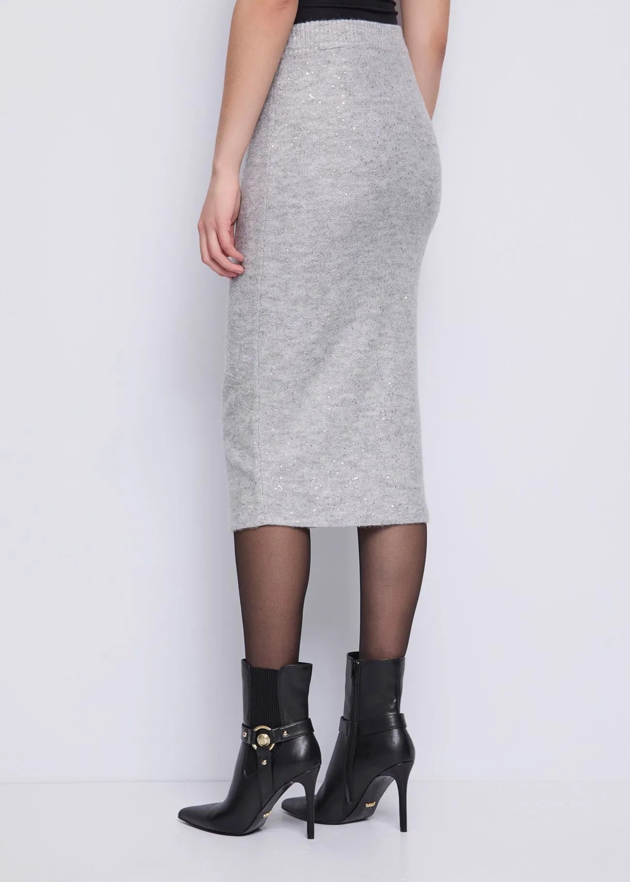 Scegli la gonna longuette in morbido filato lurex elasticizzato con paillettes ed elastico in vita. Linea a tubino per un look scintillante.