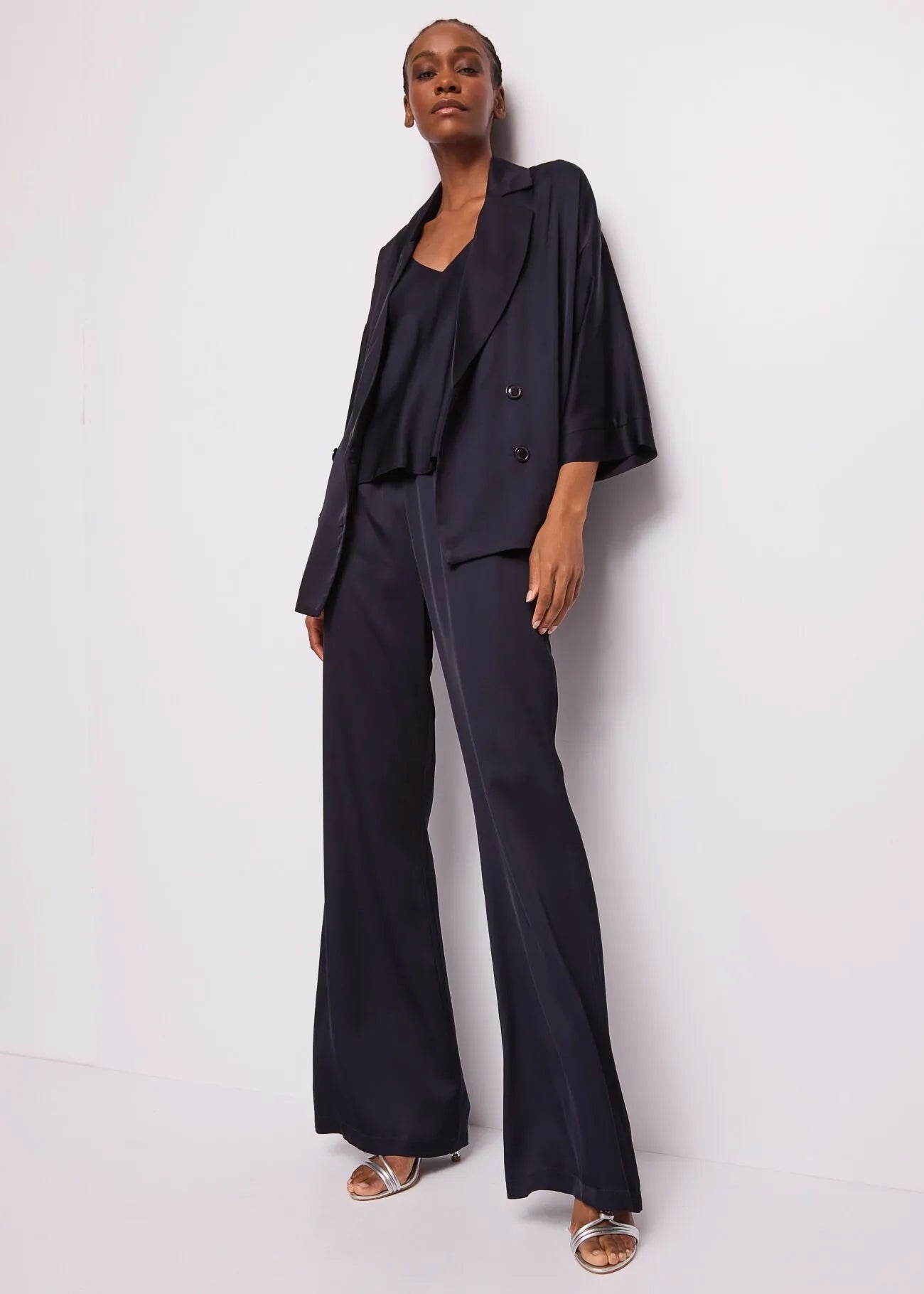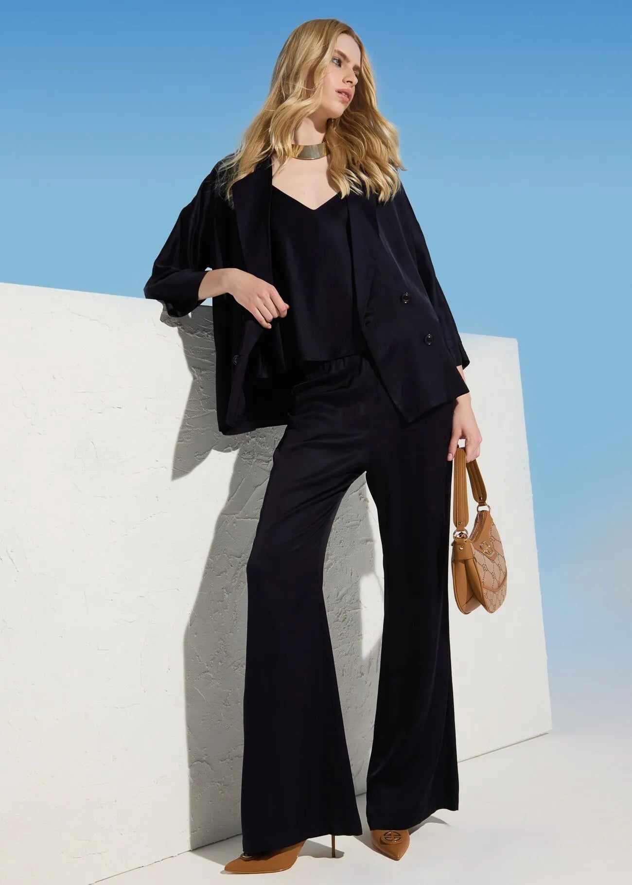Pantaloni blu da donna in raso di viscosa      Scegli i pantaloni in raso di viscosa con elastico in vita. Linea ampia e fluida...