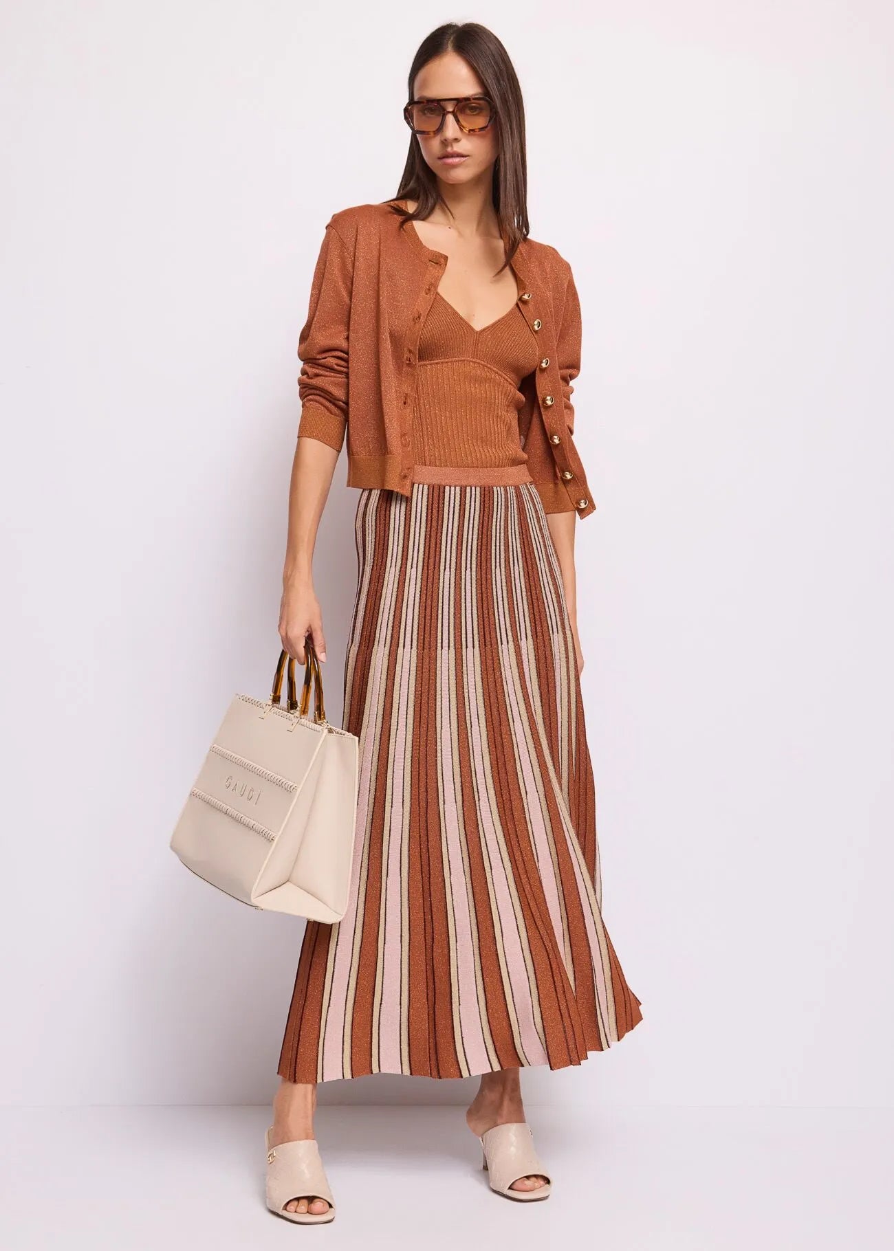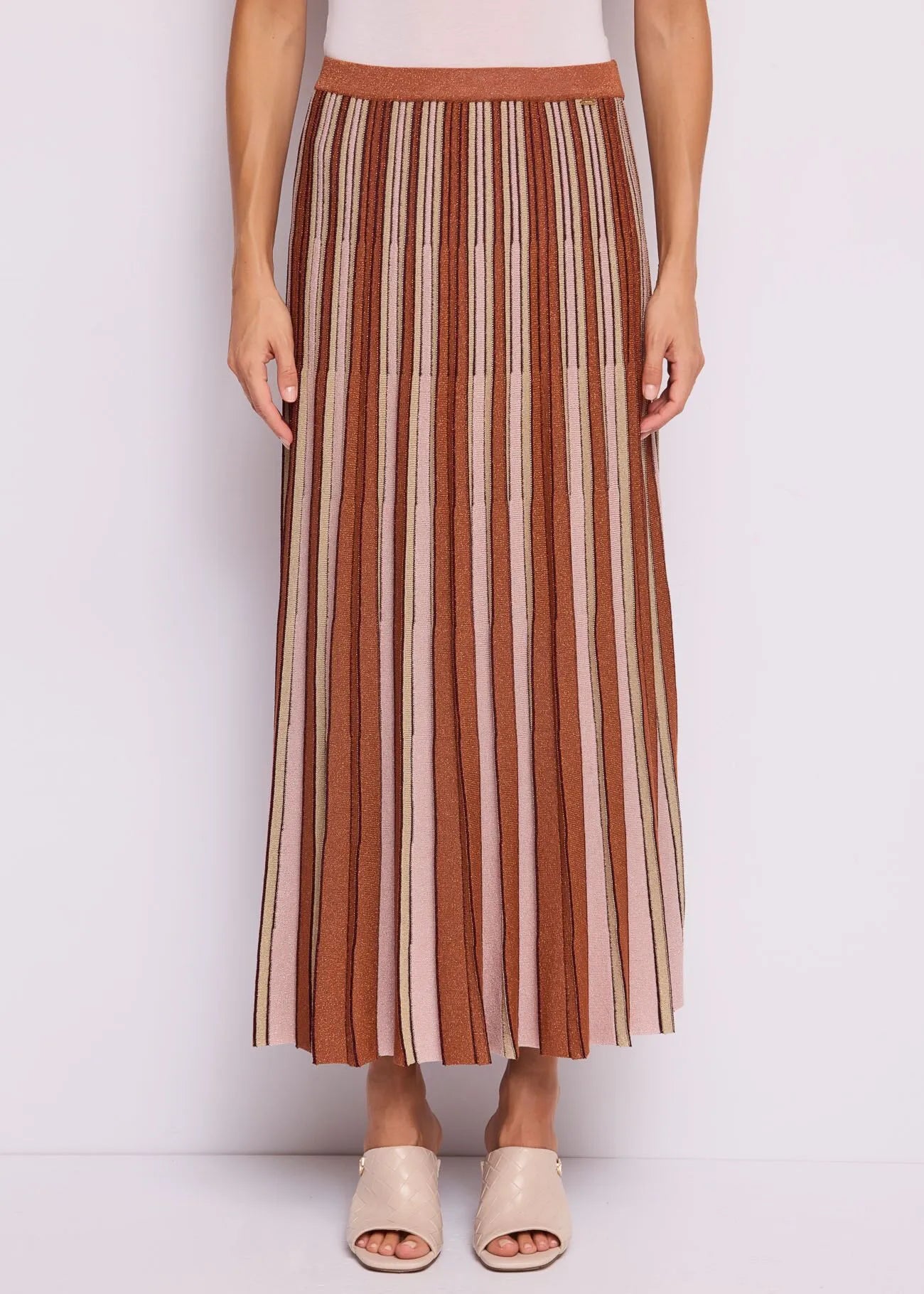 Gonna plissé in filato lurex Scegli la gonna lunga in filato lurex con motivo a righe ed elastico in vita. Morbida e luminosa per un'eleganza...