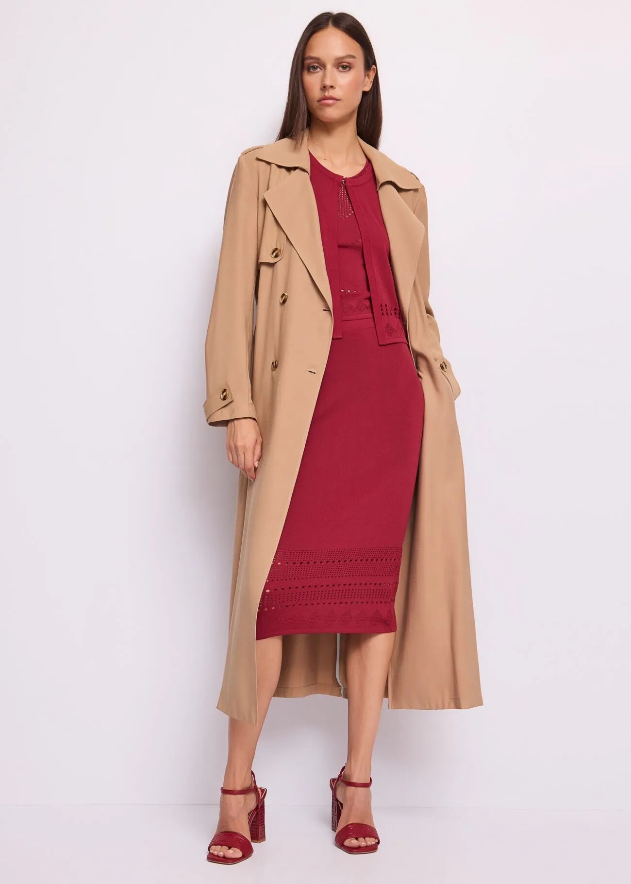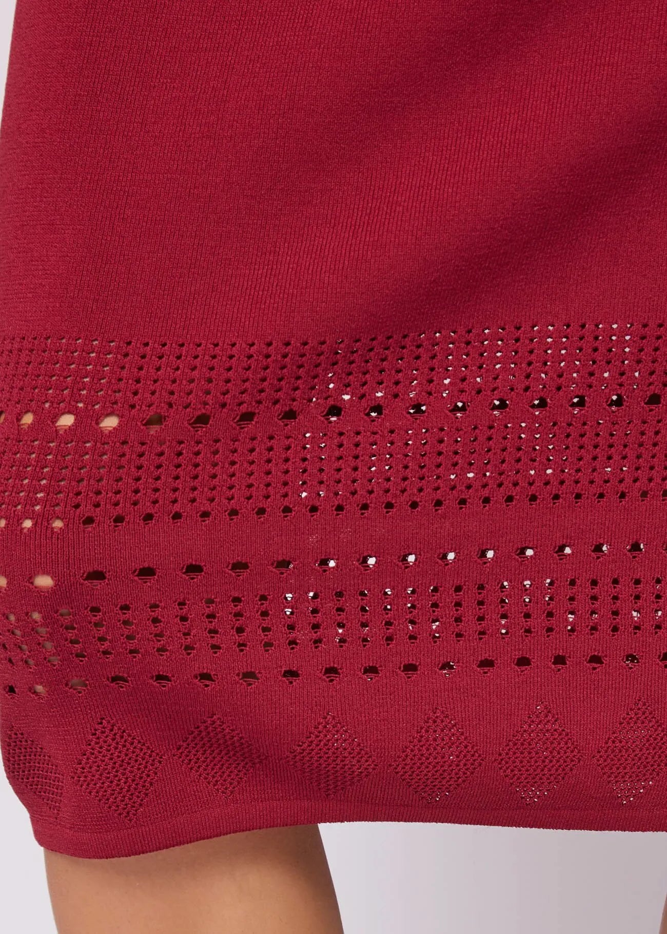 Gonna longuette in maglia Scegli la gonna longuette in morbido filato con lavorazione geometrica traforata. Linea avvolgente per un'eleganza moderna e raffinata.