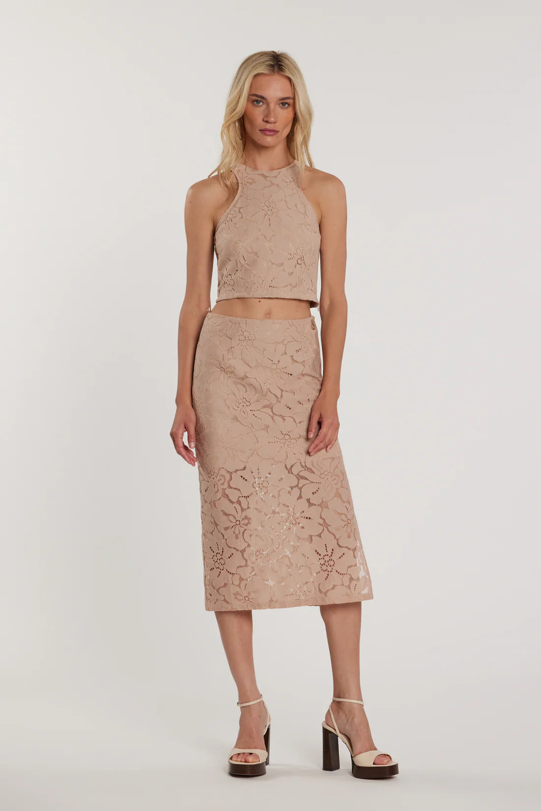 Blusa Viver corta senza maniche con scollo americano, zip e fiocco collo in pizzo, un capo elegante e femminile. Il fiocco e il pizzo aggiungono charme couture discreto, valorizzando la silhouette con raffinatezza. Ideale per cocktail o eventi speciali.